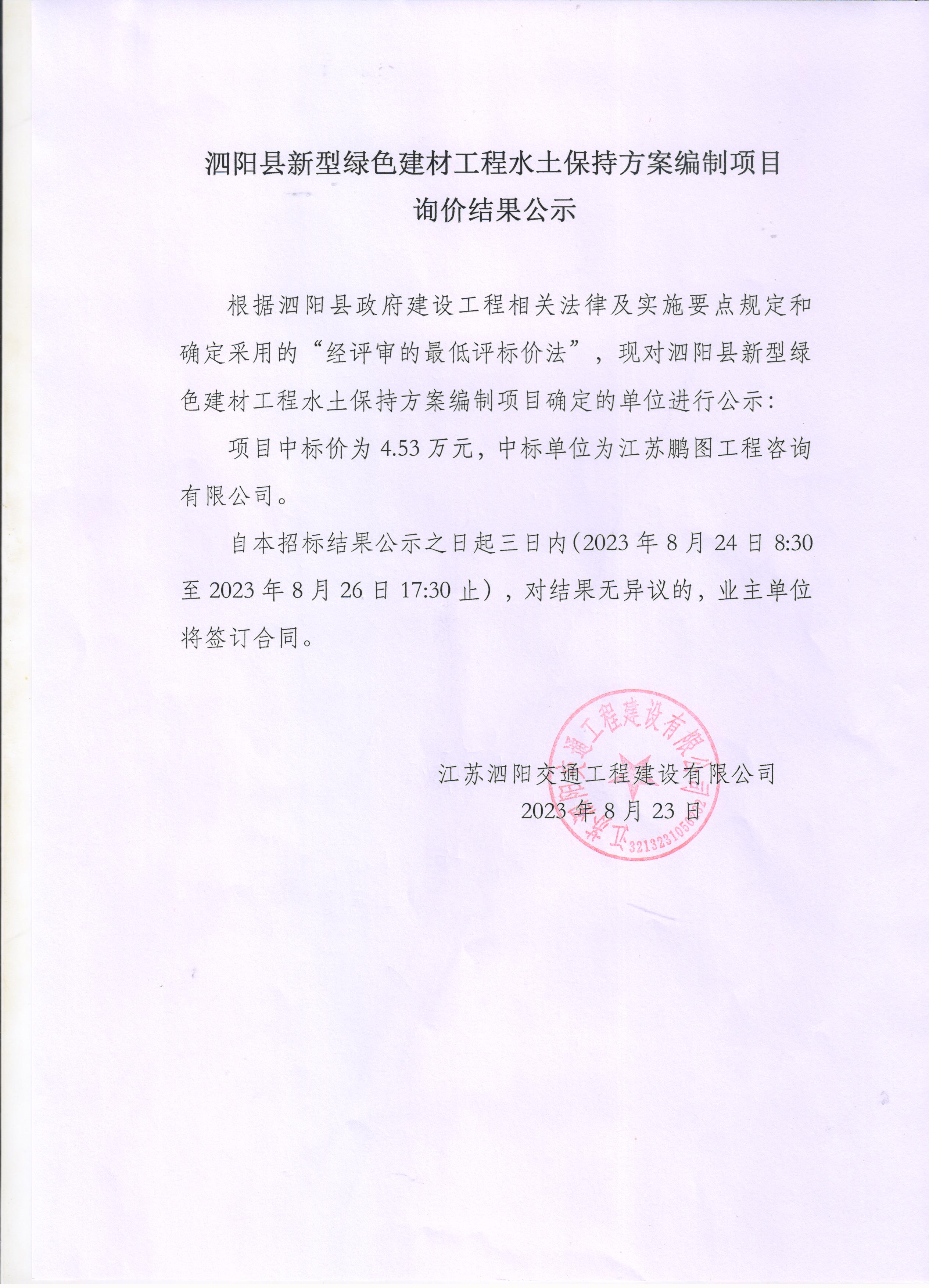 泗陽縣新型綠色建材工程安全條件分析及安全設施設計項目詢價結果公示